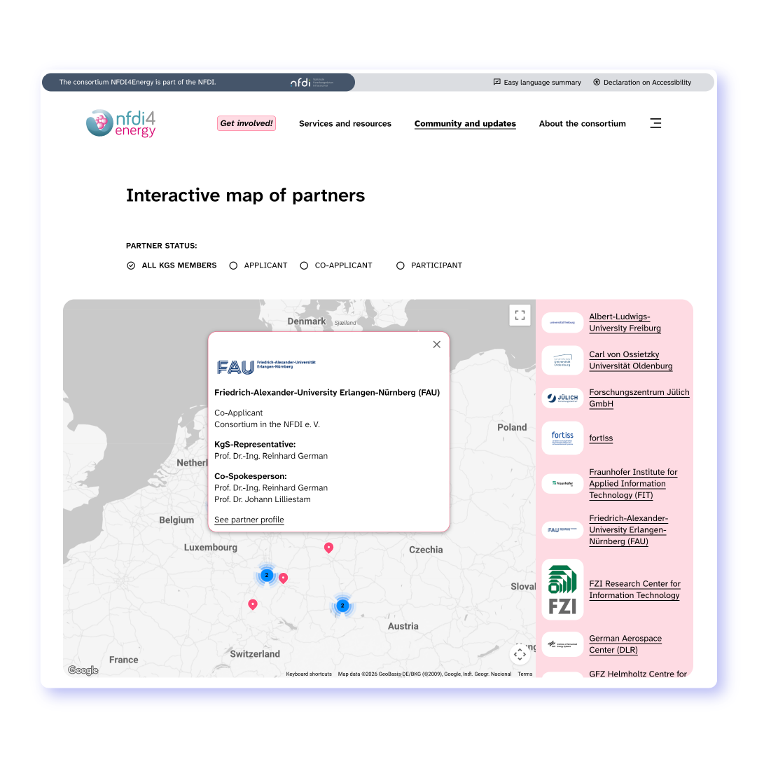 Die neue Website von NFDI4Energy wurde sowohl visuell als auch strukturell überarbeitet und präsentiert das Konsortium modern, professionell und einladend. NFDI4Energy ist die zentrale Anlaufstelle für Best Practices im Bereich Forschungsdaten im Energiesektor und gehört zum übergeordneten deutschen NFDI-Programm.