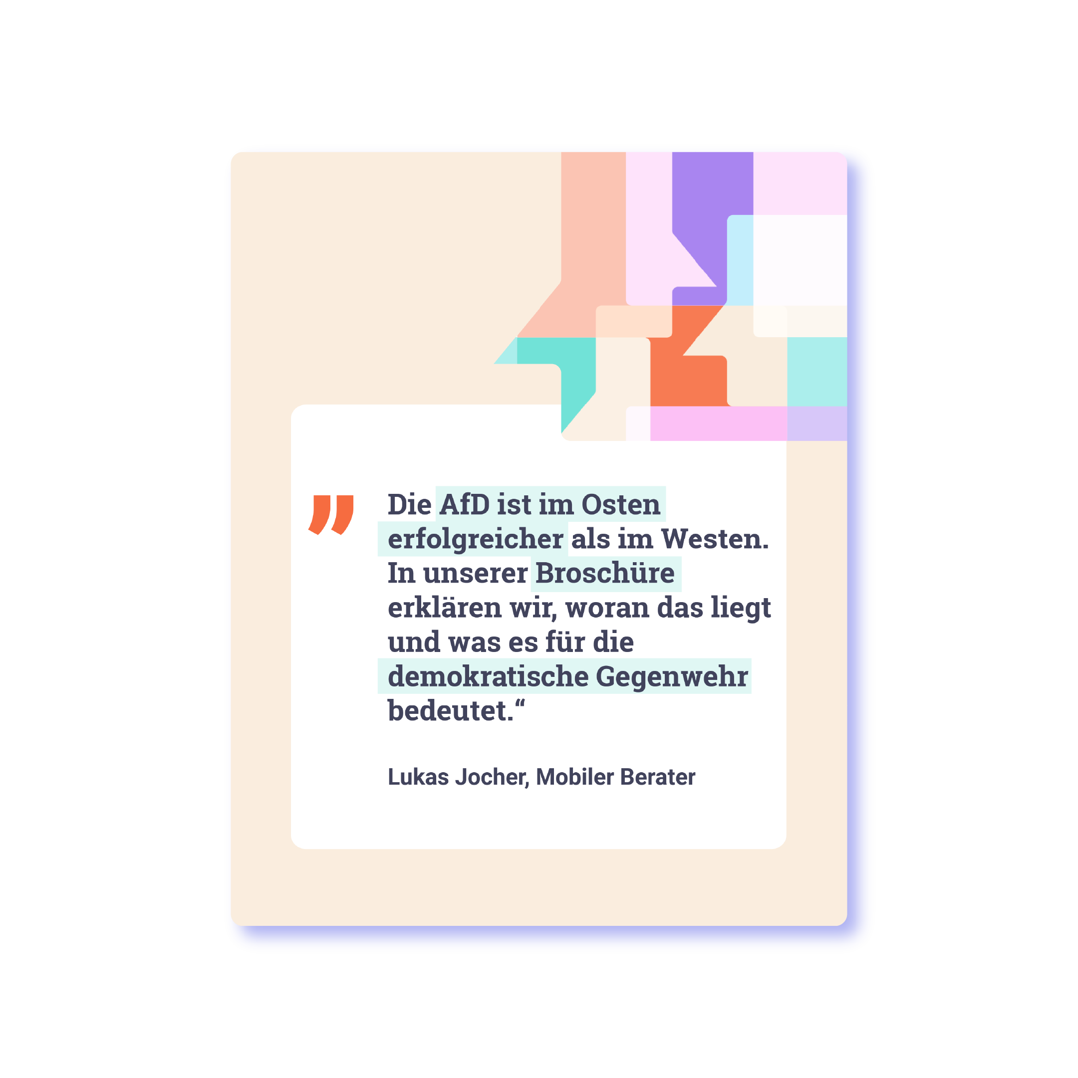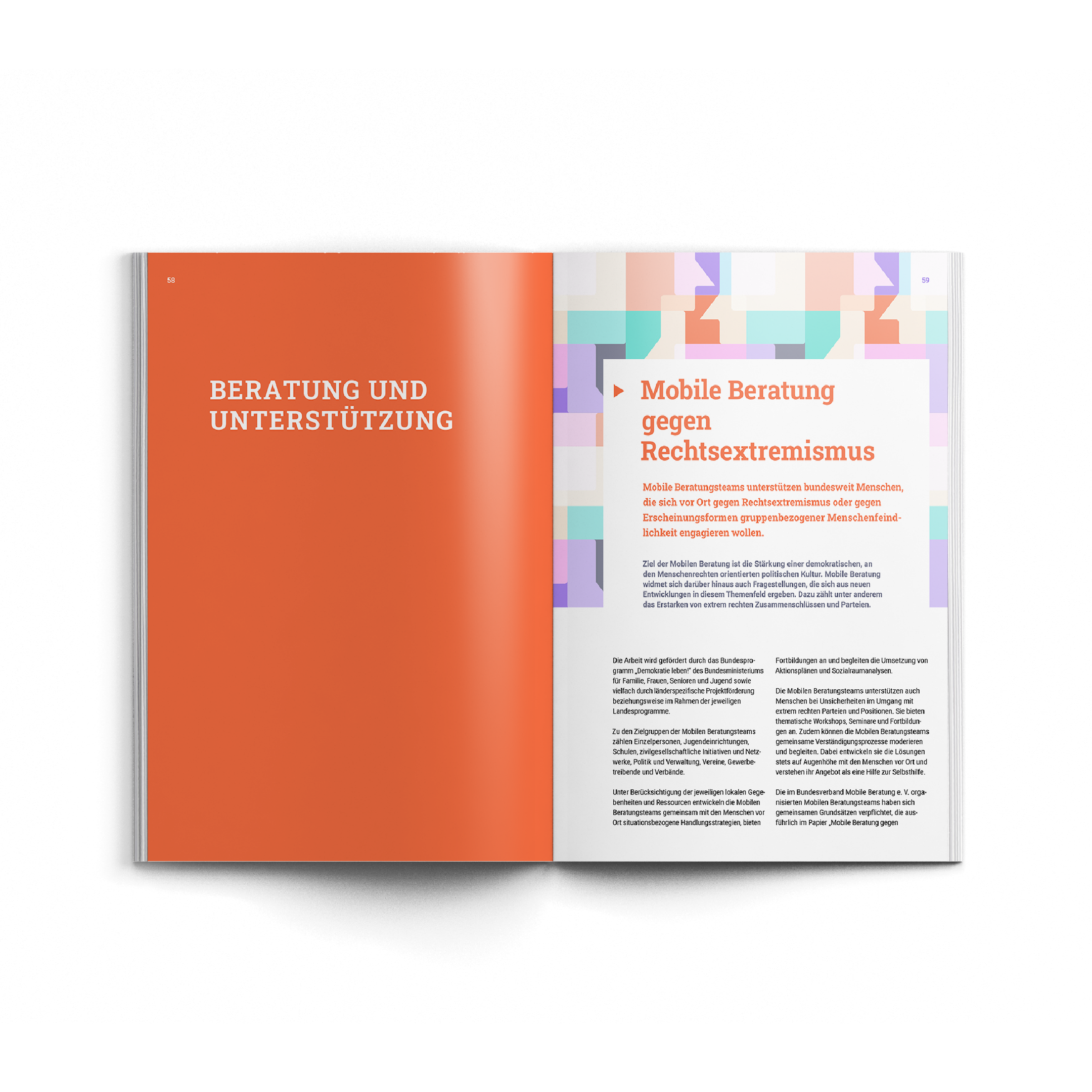 We were responsible for the design, layout, and typesetting of the publication “Engagiert & demokratisch bleiben” (Remaining Committed & Democratic). The 68-page handbook deals with the danger posed by the far-right AfD party, provides background information, and, above all, offers numerous recommendations for action based on the practical experience of its local advisors. The layout created is intended to serve as a basis for subsequent publications, ensuring that BMB's signature style is recognizable across the various publications.