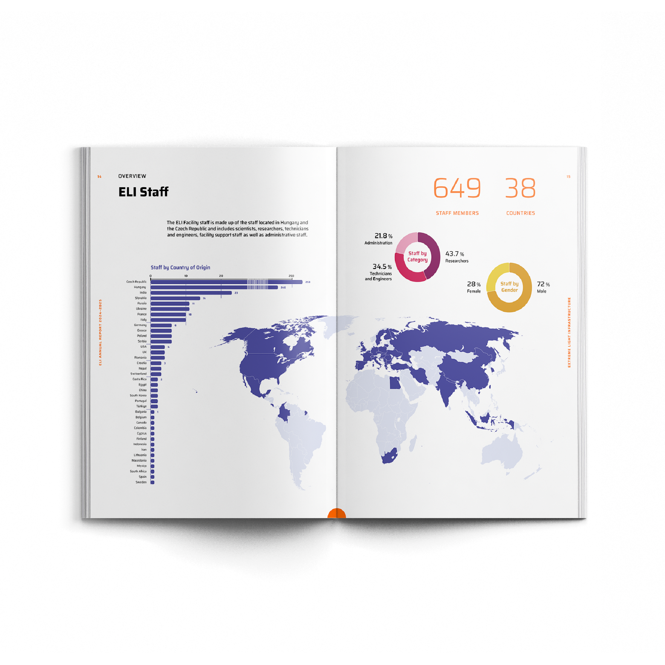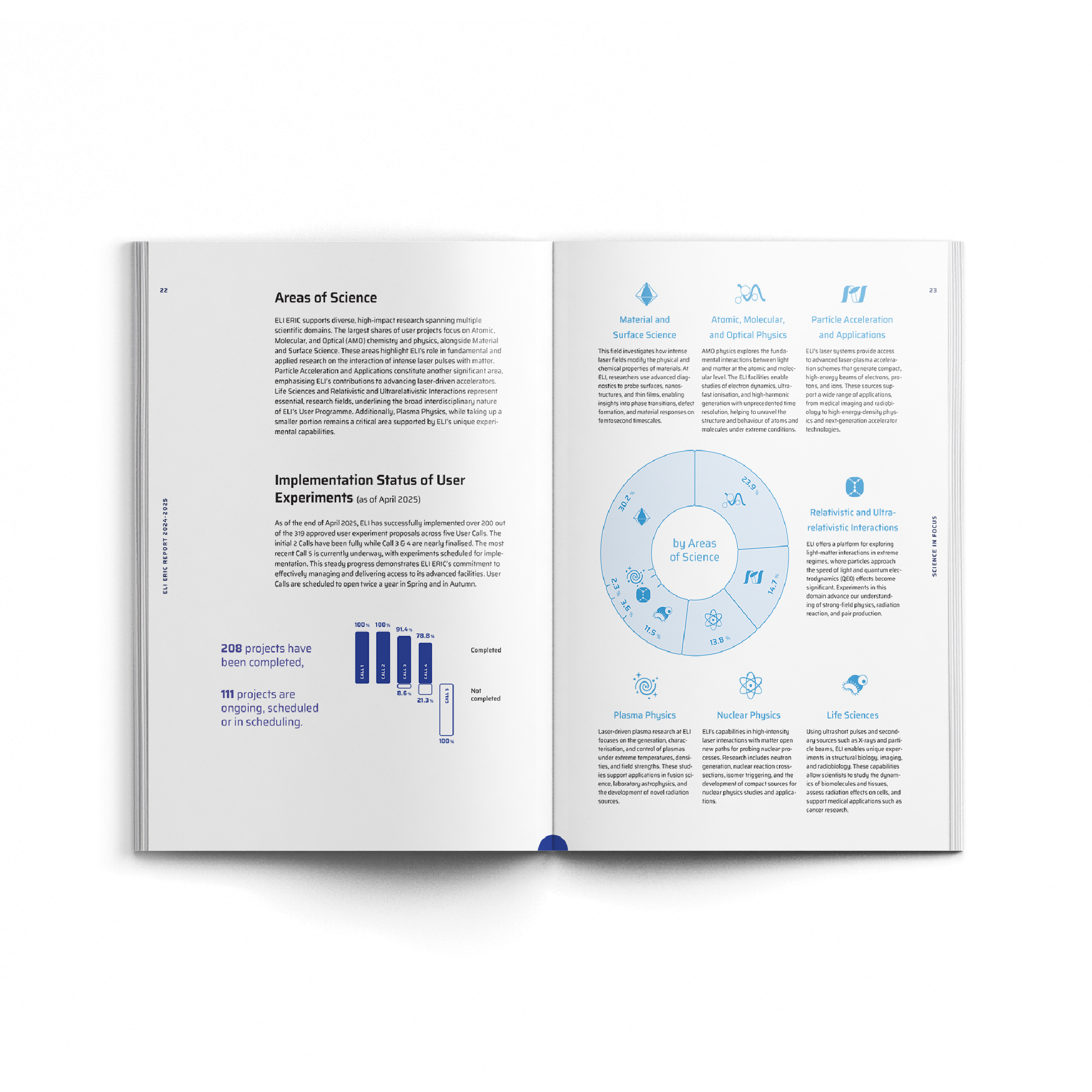 We designed, layouted and typeset the 2025 annual report as well as comprehensive infographics for The Extreme Light Infrastructure (ELI), a pan-European research institution for screen and printing.